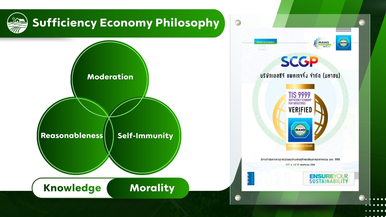 SCGP Receives TIS 9999 Standard Certification, Reflecting Sustainable Business Practices Loading Data… SCGP receives certification under the Guidance on sufficiency economy philosophy, TIS 9999 (Guidance on sufficiency economy for industries, TIS. 9999), marking another significant milestone in conducting business based on balance, stability, and sustainability. This achievement is the result of strong collaboration across all functions and also covers SCGP’s subsidiaries in Thailand, which are driving the organization in the same direction through shared concepts and concrete practices.TIS 9999 is a standard certified by the ISO Certification Institute and serves as guidance based on the Sufficiency economy philosophy. It is founded on three core principles: moderation, reasonableness, and self-immunity, underpinned by the conditions of knowledge and morality. The objective is to enable organizations to grow while caring for society and the environment in line with sustainable development principles. This certification demonstrates SCGP’s management strategy that emphasizes business efficiency while placing importance on long-term value creation and balanced, sustainable responsibility toward all stakeholders, leading to shared success. Related Contents Loading Data…