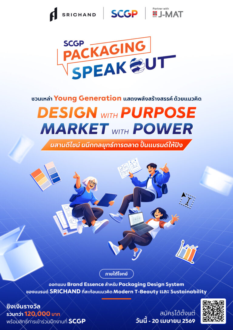 SCG Packaging Public Company Limited, or SCGP, in collaboration with Srichand United Dispensary Company Limited and the Marketing Association of Thailand (MAT), through the Junior Marketing Association of Thailand (J-MAT), presents the “SCGP Packaging Speak Out 2026” project. This competition invites university students interested in design and marketing to demonstrate their potential, showcase creativity, and further develop packaging ideas into strategic marketing tools that can create real value and deliver tangible results for brands in the business world.