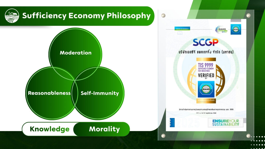 SCGP receives certification under the Guidance on sufficiency economy philosophy, TIS 9999 (Guidance on sufficiency economy for industries, TIS. 9999), marking another significant milestone in conducting business based on balance, stability, and sustainability. This achievement is the result of strong collaboration across all functions and also covers SCGP’s subsidiaries in Thailand, which are driving the organization in the same direction through shared concepts and concrete practices.
