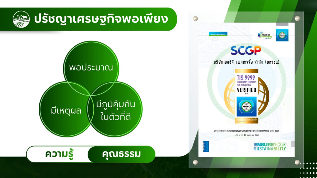 SCGP ได้รับการรับรอง มาตรฐานแนวทางเศรษฐกิจพอเพียงภาคอุตสาหกรรม มอก.9999 (Guidance on sufficiency economy for industries, TIS. 9999) ซึ่งเป็นอีกก้าวสำคัญของการดำเนินธุรกิจบนพื้นฐานของความสมดุล มั่นคง และยั่งยืน ความสำเร็จในครั้งนี้เกิดขึ้นจากความร่วมมือของทุกคนในทุกสายงาน และครอบคลุม SCGP และบริษัทย่อยในประเทศไทย ที่มีการขับเคลื่อนองค์กรไปในทิศทางเดียวกันด้วยแนวคิดและแนวปฏิบัติร่วมกันอย่างเป็นรูปธรรม
